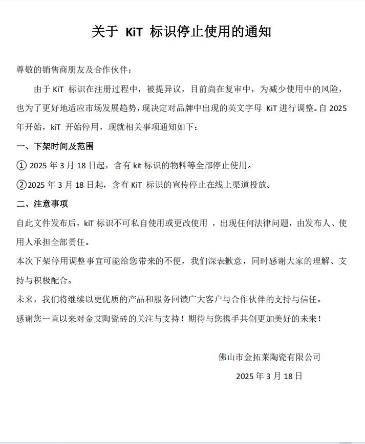 關(guān)于KIT標(biāo)識停止使用的通知——關(guān)于KIT標(biāo)識停止使用的通知
